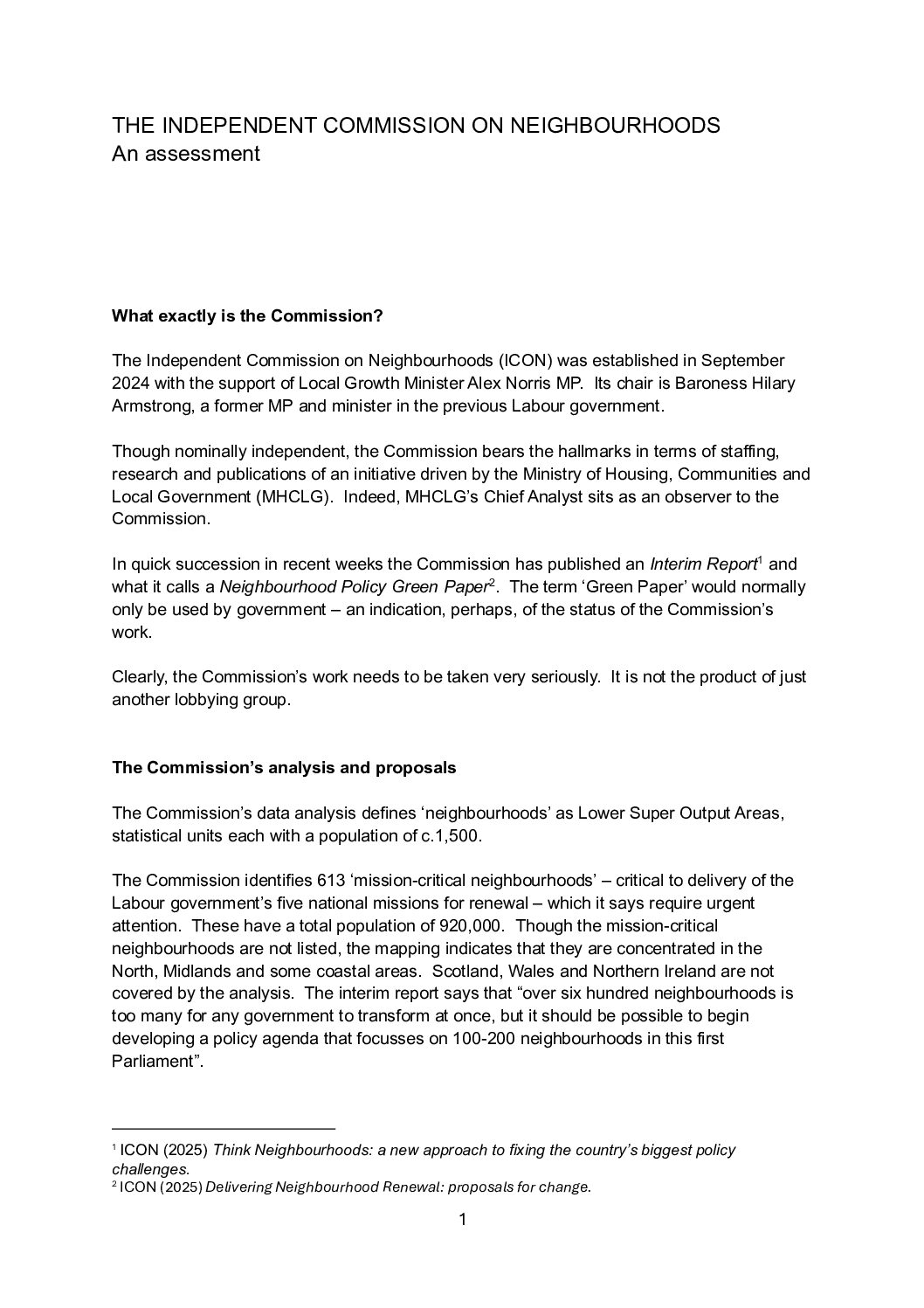 An assessment of the Independent Commission on Neighbourhoods by the Industrial Communities Alliance National Secretariat.