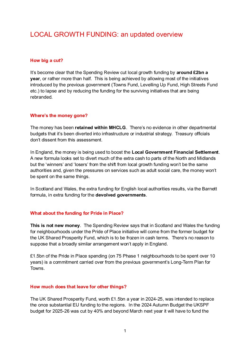 An updated briefing note on the Spending Review plans for Local Growth Funding.