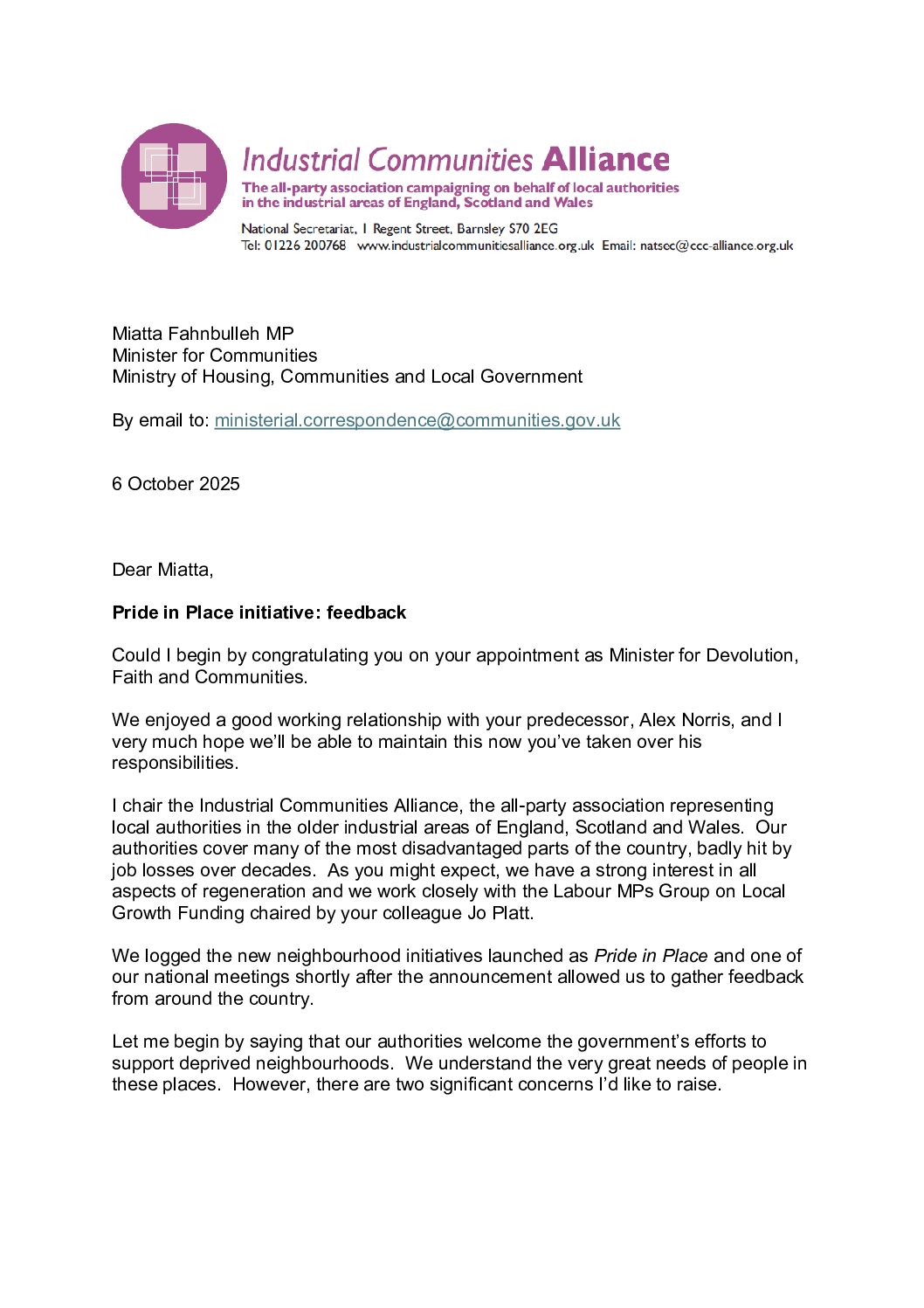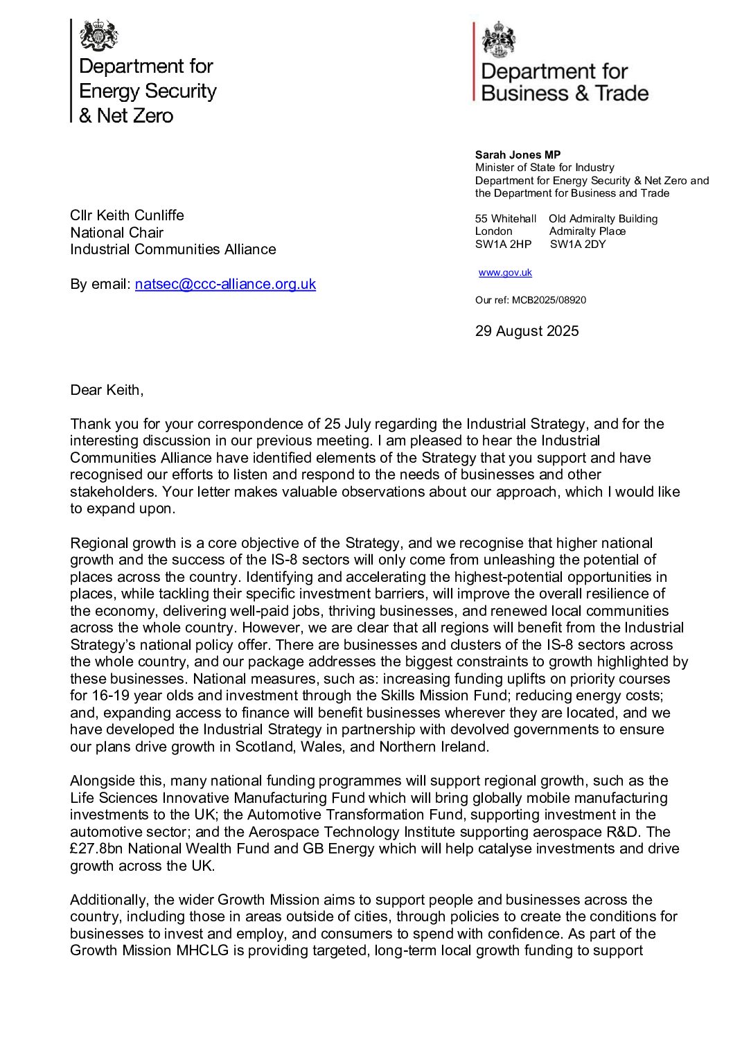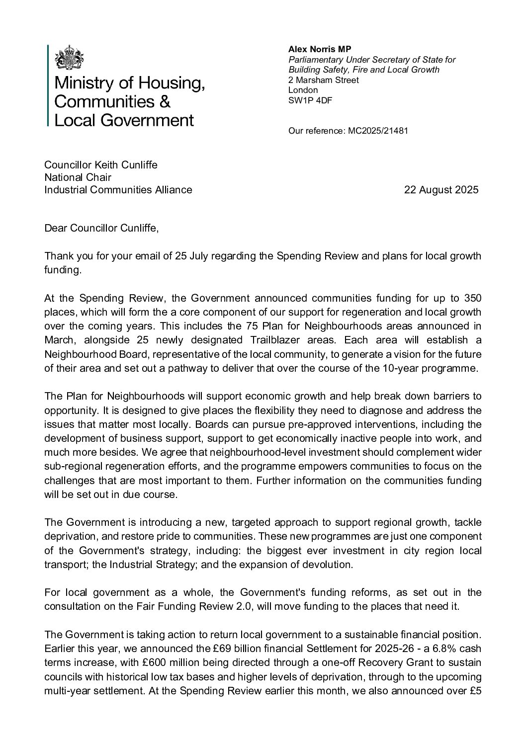 Letter to Rt Hon Peter Kyle MP (Department for Business and Trade) from Cllr Keith Cunliffe (Chair of Industrial Communities Alliance) on the Growth Mission Fund